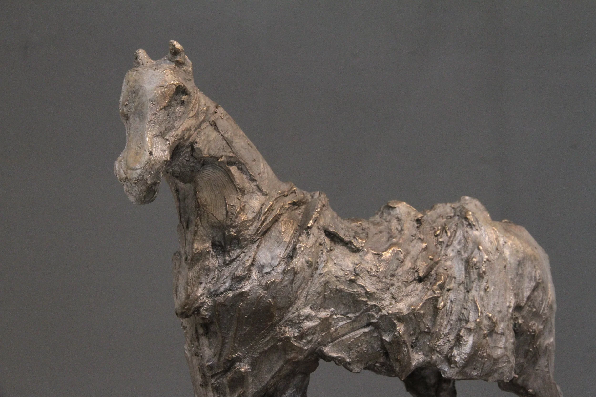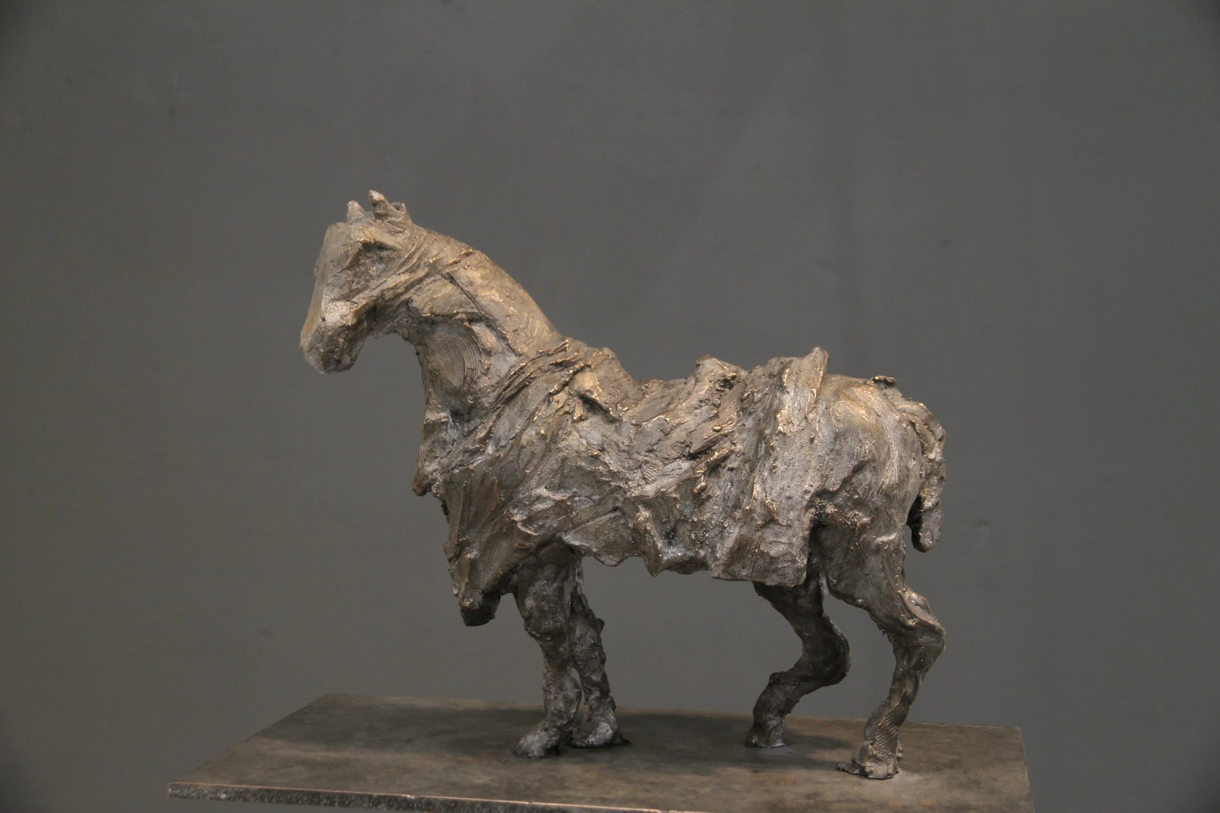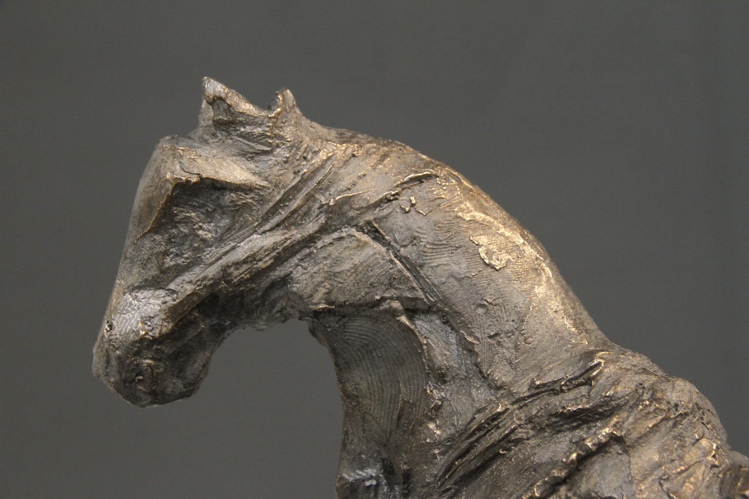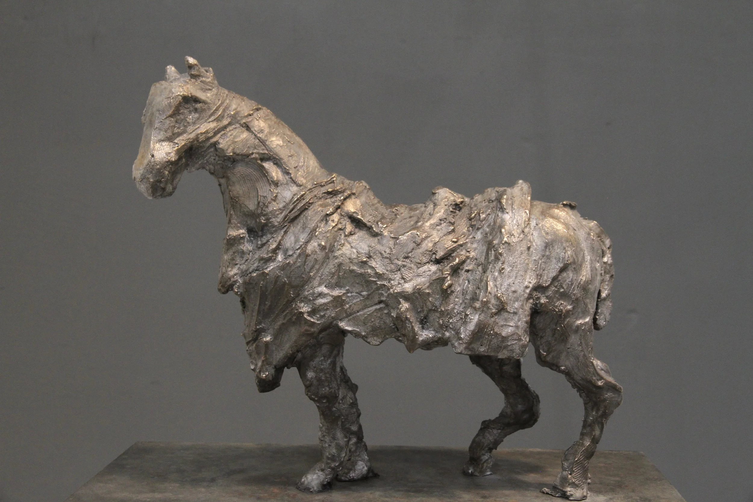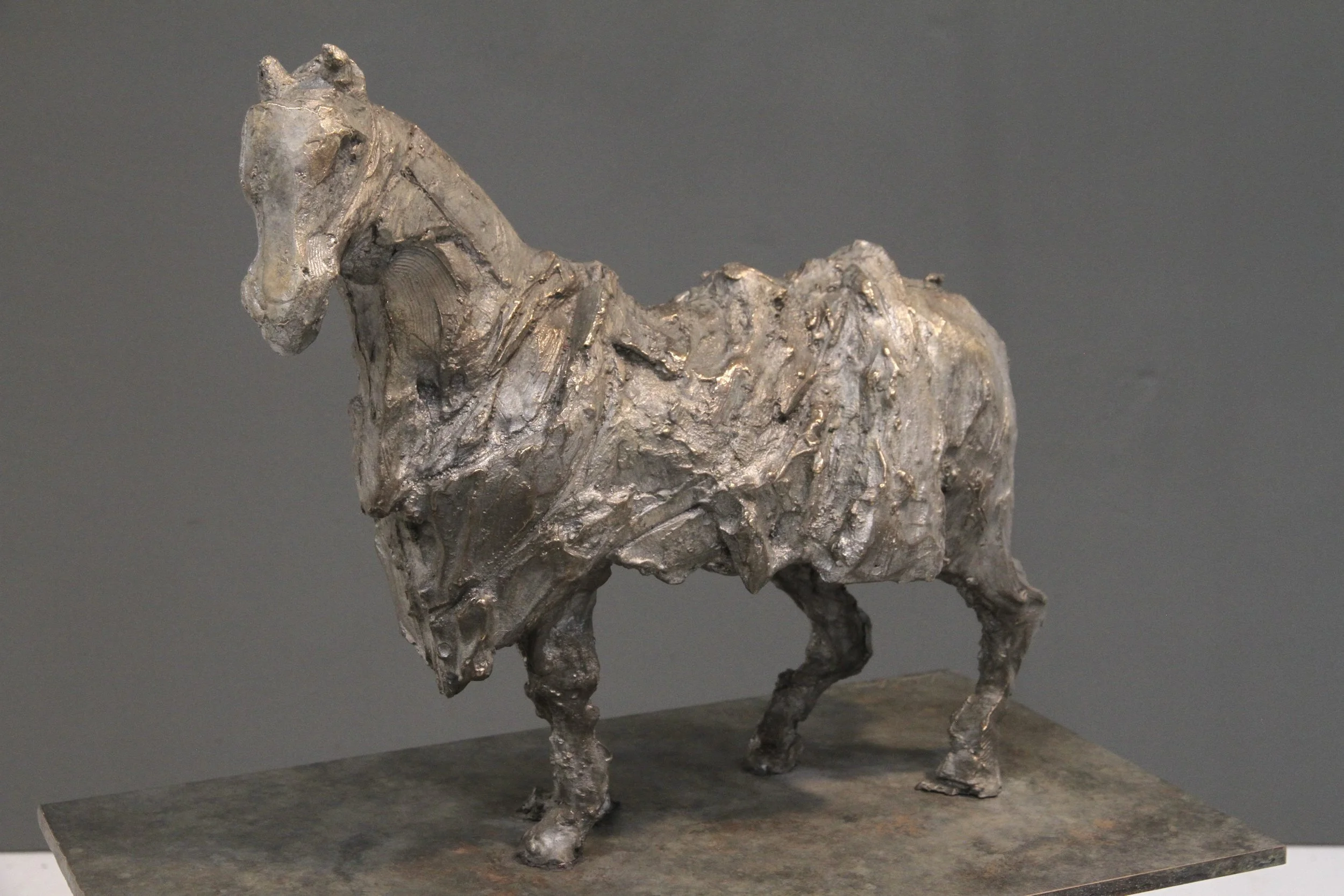 Shrouded depicts a horse draped in a protective wintry shroud, ghost-like and solitary in an unknown landscape, evoking a sense of an interior quietness. The silver patina speaks of lunar light and the coolness of night.